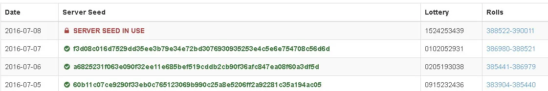 Edit: the owner of Double tells me about their use of lottery numbers. They generate their server seeds based on the previous ones and all seeds have been determined from the moment the site was created. He also tells me that other sites using similar algorithms simply generate a new seed from scratch every day. They use lottery numbers to make it so the server can’t generate strings of “favorable” rounds. So it avoids the operator purposely generating strings of rounds that are the same color, turn up not green, etc. People would be more likely to fall for the gambler’s fallacy and not bet on the same color.